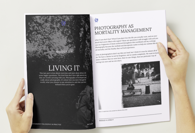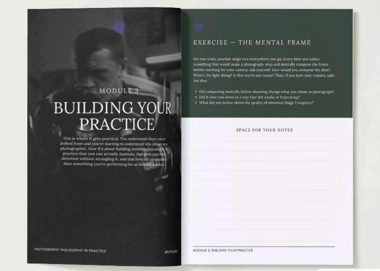 Includes the Archive Audit, the Emotion Audit, and the Camera as Armour exercise, probably the most uncomfortable and most useful thing in this workbook.