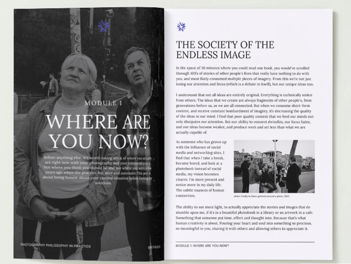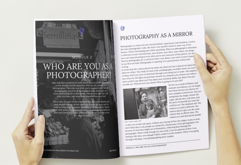 I hold a first class MSc in Cyberpsychology; the study of how technology shapes our behaviour, identity and self-concept. I think about this constantly in relation to photography and other forms of craft. How we create in a digital world. The algorithm isn't neutral, it's been reshaping what you think your work (and life) should look like. This workbook is the antidote.